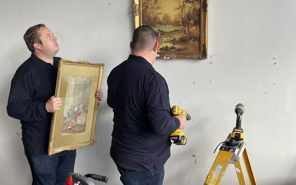 Dean and Chris put their DIY skills to the test by hanging pictures in the adjoining charity shop.
